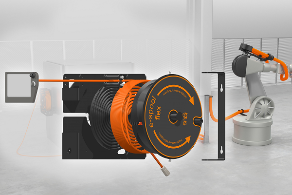 The new e-spool flex is available in two versions: one is a low-cost version with a manual turner to wind up the cable or an automatic solution with a brake and a spring-driven return mechanism. The e-spool flex is available in three sizes for cables with a diameter of 5 to 11 millimeters and an extension length of 5 to 15 meters. The cables can be quickly replaced at any time.