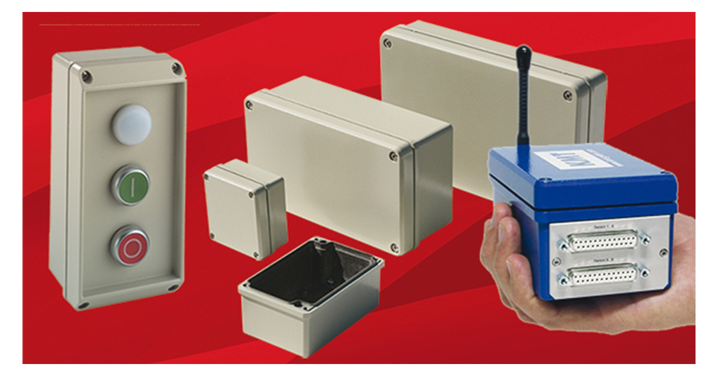 These diecast enclosures are available in four sizes, again all powder coated in pebble grey (RAL 7032). And again, custom colours are available on request. Accessories include external mounting brackets, lid holders, hinges, an installation kit, corrosion-proof coating, mounting plates, supporting rail and cable glands.