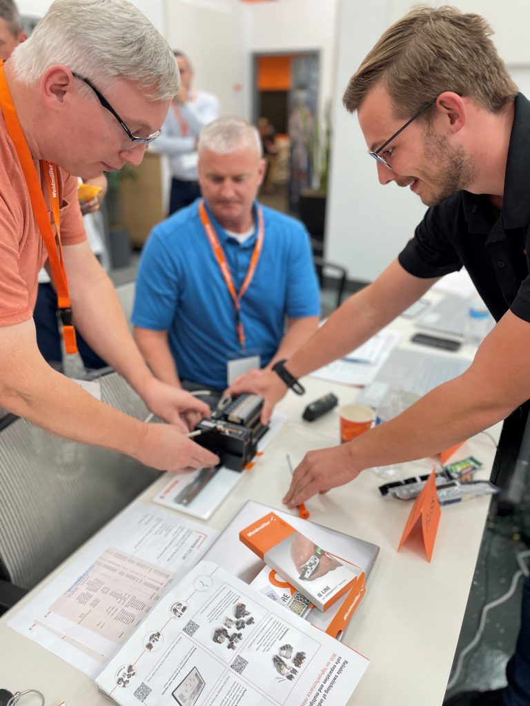 Lars Hohmeier (right), a Cabinet Products manager at Weidmuller USA, provides hands-on instruction about cabinet box products for attendees at a Distributor Connect training session.