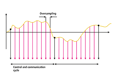 With the highly dynamic, EtherCAT-based AX8000 servo system, new setpoint values can transfer every 62.5 μs from the motion controller in the Industrial PC to the servo drive, along with μs motor current scans. Comparable control systems usually operate with a cycle time of only 1 ms. Now the AX8000 firmware also supports oversampling technology, which is well known from Beckhoff EtherCAT I/O devices. This feature enables multiple samples of process data within a communication cycle with an oversampling factor of up to 128 and the transfer of all data in an array via EtherCAT.