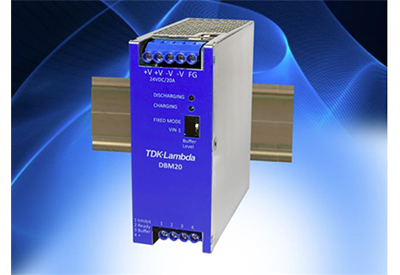 TDK Corporation recently announced the introduction of the TDK-Lambda DBM20 DIN rail mount 24V 20A buffer module. The buffer module is ideal for providing short term hold-up or peak power for loads connected to a 24Vdc output AC-DC power supply. It can supply an additional 250ms hold-up at 448W output power, or 2s with a 2.5A load. The extended hold-up time allows equipment to safely shutdown and avoid data loss during AC power interruptions. Applications for the module include industrial automation, robotics and semiconductor fabrication equipment.