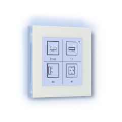 The switch-sized device has an integrated glass frame, which is backlit by the screen’s lighting. It installed in a switch box.