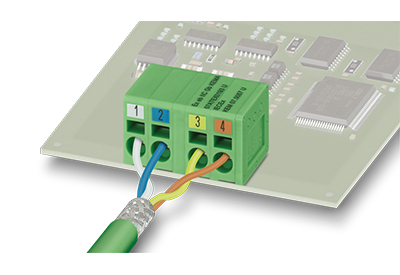 Each of the 4-position PCB terminal blocks have been designed specially for the connection of twisted pair cables with cross-sections of 0.14 mm² to 4 mm². The conductors are connected via spring- or screw connection technology. Printed or color-coded connection points allow you to assign the conductors easily. With horizontal, vertical, and angled conductor connection directions, the PCB terminal blocks are suitable for a variety of device designs.
