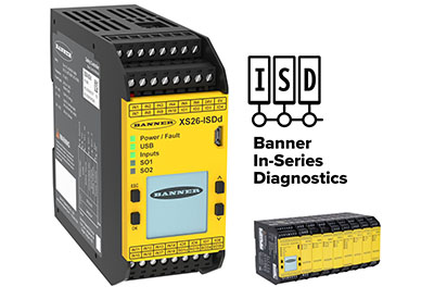 An enhanced version of Banner’s XS26 Safety Controller is now available with built-in In-Series Diagnostics (ISD). This technology simplifies installation, provides comprehensive real-time data about automation safety equipment, and prevents or reduces downtime. The expandable XS26-ISDd allows users to configure and monitor up to 394 connected safety devices—such as E-stop buttons, safety switches, safety light screens, two-hand controls, and rope-pull switches—and controls up to 68 independent safety outputs. It is a cost-effective solution to meet machine-safeguarding requirements, with the flexibility to grow with expanding production and future technology enhancements.