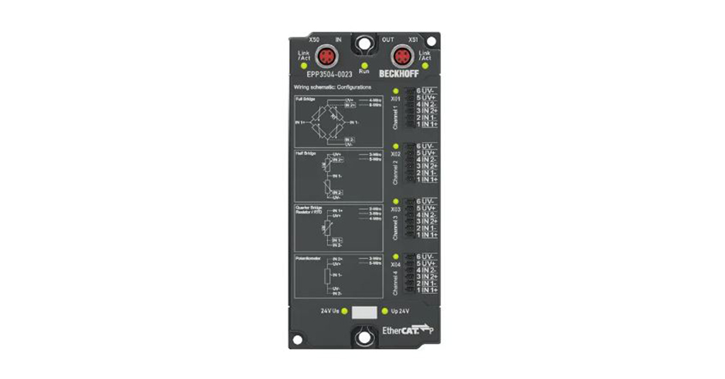 The EPP3504-0023 EtherCAT P Box is designed for the evaluation of measuring bridges in full-bridge, half-bridge and quarter-bridge configuration. It also supports the potentiometer, Pt1000 (RTD) and ±10 V measuring ranges. It is derived from the ELM3504 EtherCAT Terminal and features a sampling rate of 10,000 sps, internal switchable supplementary resistors, and an integrated, parametrizable bridge supply.
