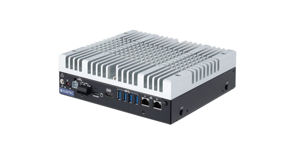 This new series of fanless embedded computers is equipped with NVIDIA Jetson AGX Orin AI modules specifically designed for embedded devices. These computers offer AI performance comparable to data center GPU cards, with up to 275 TOPS (INT8)—about 8 times the performance of previous Jetson AGX Xavier modules. Contec’s proprietary heat dissipation technology, which includes large heat sinks, ensures fanless operation in a compact 200(W) x 200(D) x 65(H) mm (7.8 x 7.8 x 2.5 in) chassis, allowing for the use of two devices in an EIA 19-inch rack with a 2U height.