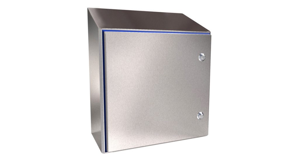 Introducing the HYW Series hygienic Type 4X stainless steel wallmount enclosure from Hammond Manufacturing, designed to enclose electrical and/or electronic equipment and protect against harsh, hygienic environments for wallmount applications. A sloped top prevents water from resting on top as well as providing potential for controls mounting, while an internal hinge design and door-edge mounted silicone gasket allow for easy cleaning in hose-down environments. A wide range of sizes and practical accessories make this product line a complete package.