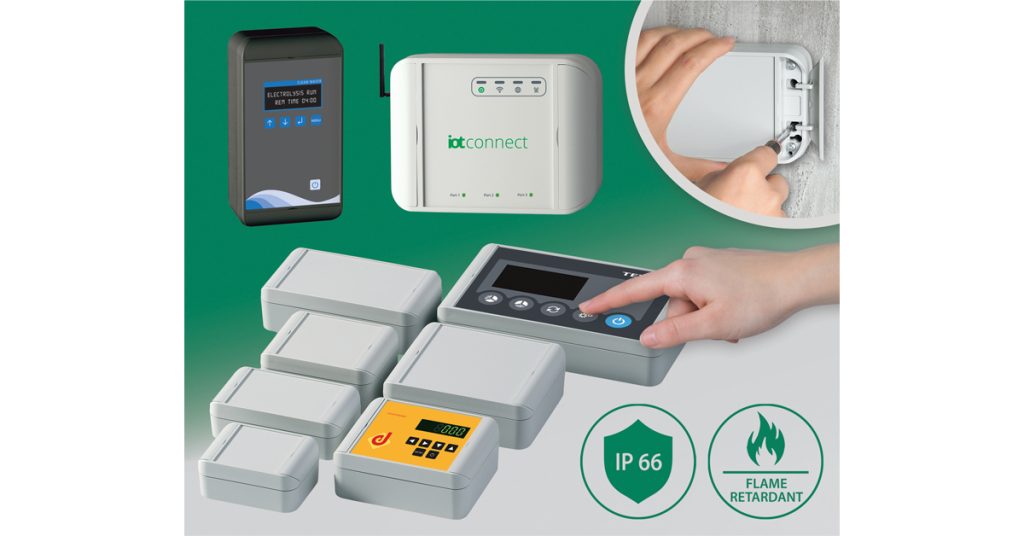The enclosures are molded from tough UV-stable ASA+PC (UL 94 V-0) in light gray (RAL 7035) as standard. They are available in eight sizes from 4.72″ x 3.54″ x 1.97″ to 11.02″ x 6.69″ x2.36″. Widths 3.54″, 4.33″, 5.11”, 5.90″ are rated IP 66; 6.69″ is rated IP 65.
