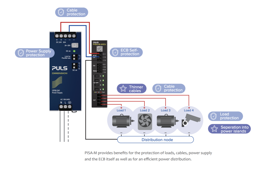 PULS has expanded its PISA series of electronic circuit breakers (ECBs) with (6) new PISA-M 4-channel ECB models. The new PISA-M units are an efficient solution for creating multiple lower power circuits from a single power supply to reduce system costs, wiring, complexity and space requirements.