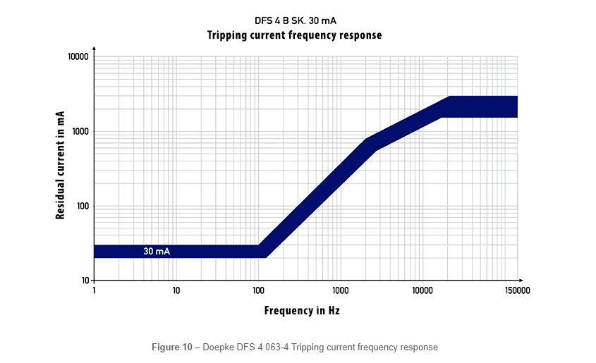 Preventing nuisance tripping can be accomplished by more than a good system layout. Intelligent RCDs can be purchased that have frequency dependent switching characteristic. The tripping current frequency response of a Doepke DFS 4 063-4 RCD is shown in Figure 10, the allowable ground current increases as the frequency increases. This makes the RCD more tolerant to the high frequency ground currents VFDs produce during normal operation.