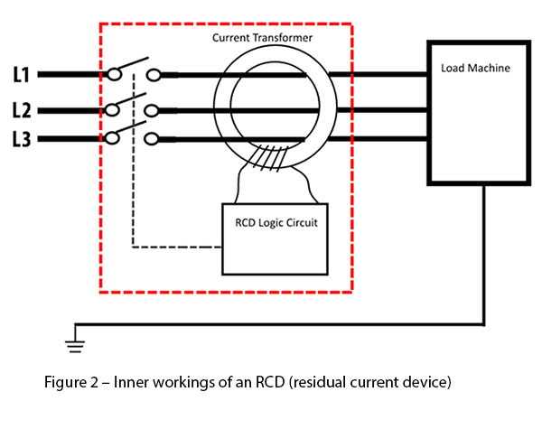 An RCD or GFCI device uses a current transformer (CT) to measure the net current flowing through the line conductors. It can be assumed that any current that does not flow through the line conductors is flowing through the earth ground. Therefore, if the net current through the RCDs CT is above some threshold, the RCD will trip removing power. RCDs are offered with three or four wire variants for three phase systems and three phase with neutral systems. The four wire variant allows current to flow between a phase and neutral without tripping the RCD.