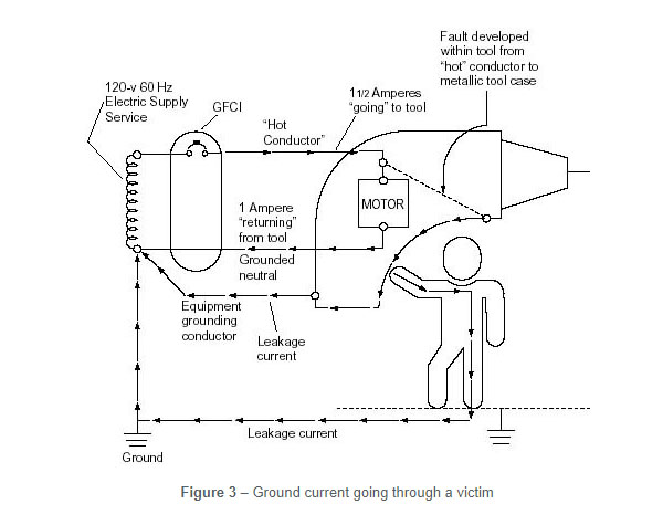From the Occupational Safety and Health Administration’s (OSHA) website, one can see an example of unwanted ground current through a person in Figure 3. The figure shows a ground fault where the “hot” line of the single phase 120V supply is connected to the grounded case of a tool. The fault causes the metal case of the tool to become live, when the tool operator touches the tool, the operator receives a shock. Fortunately, the tool is plugged into a GFCI outlet. While the “hot” conductor is supplying 1.5 amperes of current, only one ampere of current is returning through the neutral conductor. The ½ ampere difference will be detected by the GFCI and cause the GFCI to disconnect power, thus saving the tool operator from further injury.