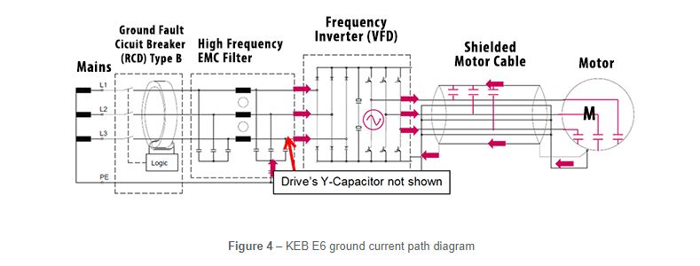 KEB’s drives feature decoupling X and Y rated capacitor [1] between the phases and phases to ground to provide a return path for ground currents before they reach the RCD installed upstream of the drive. High frequency currents generated by the VFD’s rapidly switching output travel through the motor cables and motor case to ground; then returns to the drive via the Y-capacitor. For most applications, the decoupling capacitors installed within KEB’s drives are sufficient to prevent an excess of ground current from leaking back into the machines electrical system. For many applications where controlling leakage current is more critical or multiple drives are used, the inclusion of KEB’s E6 series of filters becomes necessary. The E6 series of filters include larger decoupling capacitors between the phases and ground. The greater capacitance provides a lower impedance path for ground currents to return to the VFD.