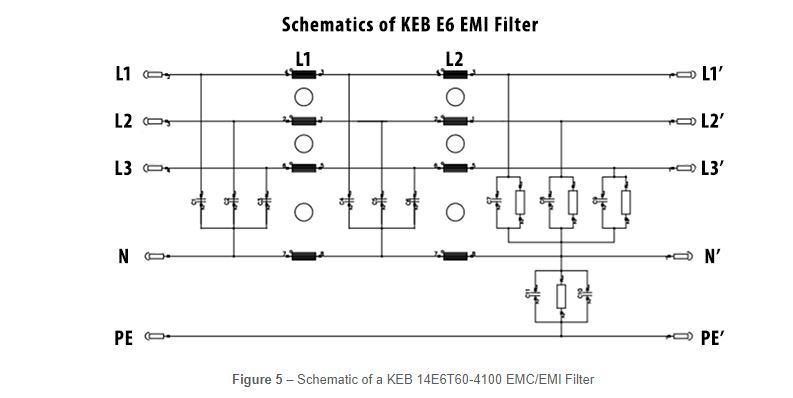 KEB’s E6 series filters are constructed to provide common mode inductance to each phase as well as capacitive coupling between the phases and each phase and ground. Some of KEB’s E6 filters such as the 14E6T60-4100 provide a neutral connection so they can be paired with four wire RCDs in four wire systems. Figure 5 shows a schematic of a 14E6T60-4100 from its data sheet.