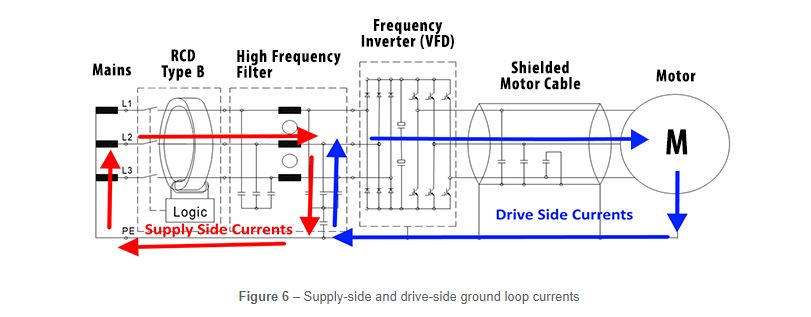 There is a drawback to decreasing the total impedance to ground. As the impedance to ground lowers, the amount of current to ground introduced from the supply-side of the circuit increases. The supply-side ground loop is shown in Figure 6. This ground current flows in from the supply through the RCD and EMC-Filter and returns to the branch circuit’s ground connection. Supply-side and drive-side currents are shown in Figure 6.