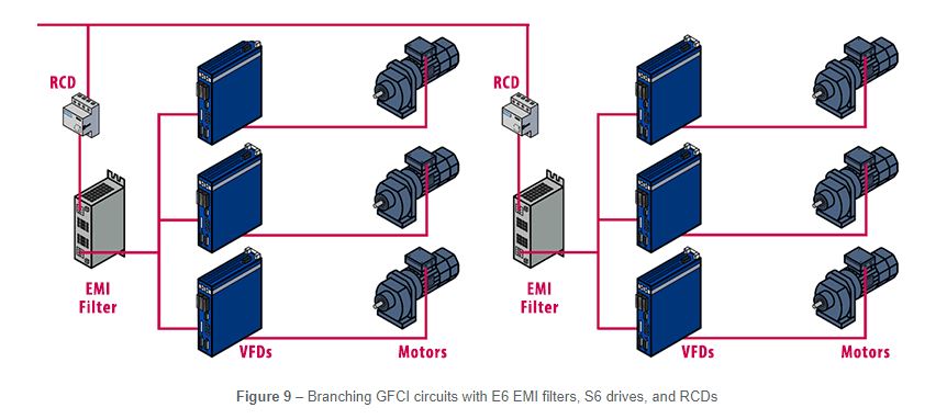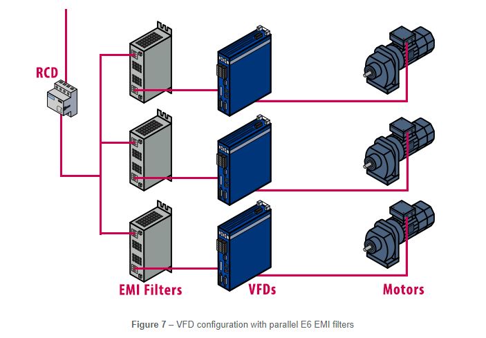 In conclusion, there are a number of factors to consider when working with systems that use RCDs and VFDs together. The increased ground current VFDs produce must be considered to prevent nuisance ground fault tripping. Sound machine design and layout significantly reduce ground current issues. If ground current leakage remains an issue the careful employment of E6 filters along with intelligent RCDs can be used. In the end, the mitigation of ground currents increases machine safety and robustness.