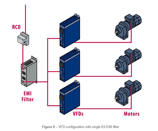This increased supply-side ground current risks tripping the RCD during normal operation. Making matters worse, many machines have multiple drives installed and an inexperienced machine designer may install an E6 filter for every drive in the machine as shown in Figure 7. The cumulative leakage current through each filter increases the chance of tripping the RCD. To prevent the increase in leakage current, a single filter should supply power to the group of drives. The single filter will offer a lower impedance path for drive side high frequency currents to return to the drive, while having a high enough impedance to prevent the flow of excessive supply side leakage current. A single filter layout is shown in Figure 8.