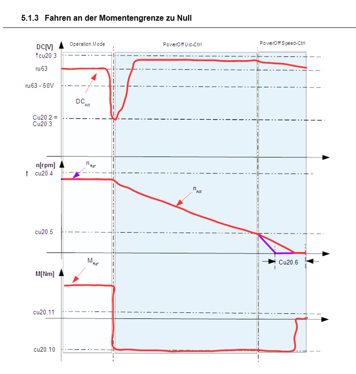 Once the actual speed reaches the stopping speed level, the DC link control is now replaced by the speed control loop with a set point of 0 rpm. The system is then brought to a stop. After the Power Off deactivation time is expired, a fault message can be initiated to the control system that a power off situation has occurred.