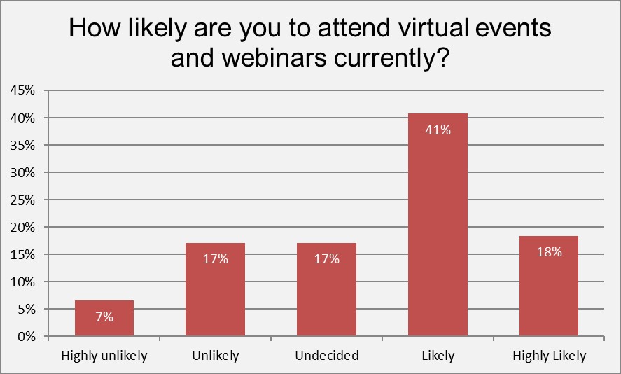 Of those surveyed 41% said they were likely to attend events while 18% noted they were highly likely. This demonstrates that currently 59% of professionals in the panel building market are currently considering engaging in virtual events and webinars. And with another 17% undecided it is only 24% of people that are unlikely to engage.