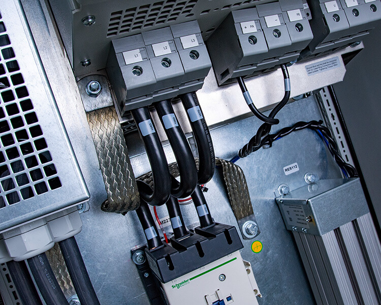 KEB recommends using UL1283 or UL1284, high strand count cable for motor cable from the VFD to the sine filter and from the sine filter to the motor. Any cables that exit the enclosure to the motor should be shielded or in a metal conduit. The shield or conduit should be connected directly to the main ground lug of the VFD.