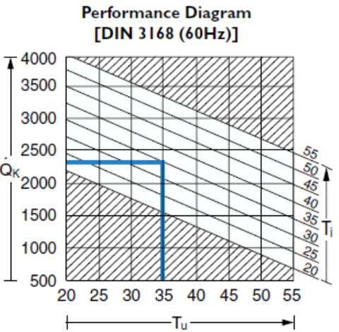 DIN 3168 testing is performed at L35/L35. The first L35 refers to the internal temperature of the enclosure (35ºC or 95ºF) and the second L35 is the ambient temperature. In Figure 1 (right), the horizontal axis is the outside temperature and the vertical axis represents the cooling capacity. The diagonal lines are the internal temperature intersects. To read the chart, select the outside temperature on the horizontal axis, draw a line up to the desired internal temperature, then draw a horizontal line up to the Y-axis. For the example shown here, the unit’s cooling capacity at L35/L35 is 2350Watts (8000 BTU/hr).