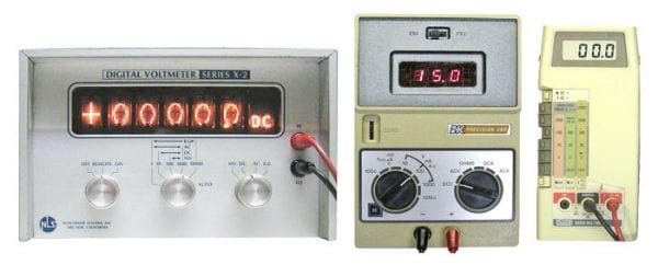 Non-Linear Systems (NLS) was an early innovator of digital multimeters (DMMs). The X-2 model (left, 1966) was a benchtop unit that measured DCV, ACV & ohms. Its transistor circuitry and nixie tube display required AC power.