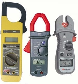 A clamp meter simplifies AC current measurements by inductively sensing the current flow in a conductor. This eliminates breaking the test circuit, as is required when using a standard ammeter. Pyramid Amprobe introduced one of the first multifunction clamp meters. Their Model 300 AC Volt-Ammeter (left, 1950) measured up to 600VAC using normal test leads and up to 300AAC by placing the jaws around the conductor. Other models in the series had larger jaws and measured up to 1200A.