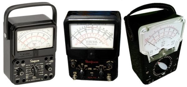 US soldiers in World War II used the Simpson 260 (left in the photo) for field service work. This rugged volt-ohm-milliammeter (VOM) had 20 ranges and a higher input sensitivity than earlier VOMs (20kΩ/V on DC and 1kΩ/V on AC). It needed no power for voltage and current measurements but used a dry cell battery for the ohms function. The 260 became an industry standard and is still manufactured in 9 versions, including one in the original bakelite case.
