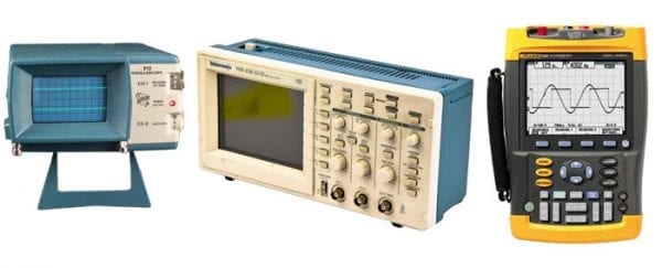 Early oscilloscopes were large and generally intended for bench use. A few were advertised as portable models, such as the RCA WO-57A (left in the photo, circa 1950). This single-channel instrument featured a 500kHz bandwidth and 3” cathode ray tube. At 10”x13”x8” and 18lbs, it was half the weight of the typical scope at that time.