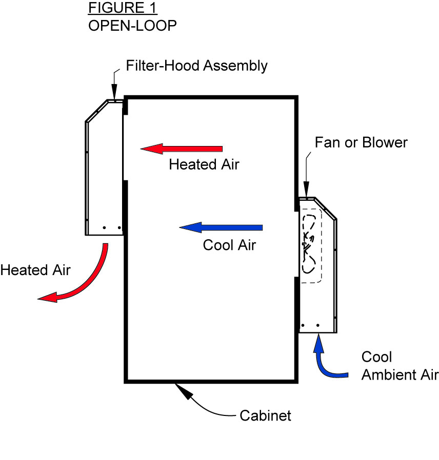 OPEN-LOOP cooling describes a process that replaces the air inside a chamber with “fresh” cooler air from outside the chamber. Open-loop cooling is the most commonly used process when the available air supply is cool enough and clean enough to provide the required heat removal. Open-loop ventilation uses ambient air to remove the heat, and may consist of small muffin-type fans that exhaust or supply an electrical cabinet, with optional filters to prevent airborne aerosols and dust from entering the cabinet. Fans have the advantage of utilizing a minimum amount of