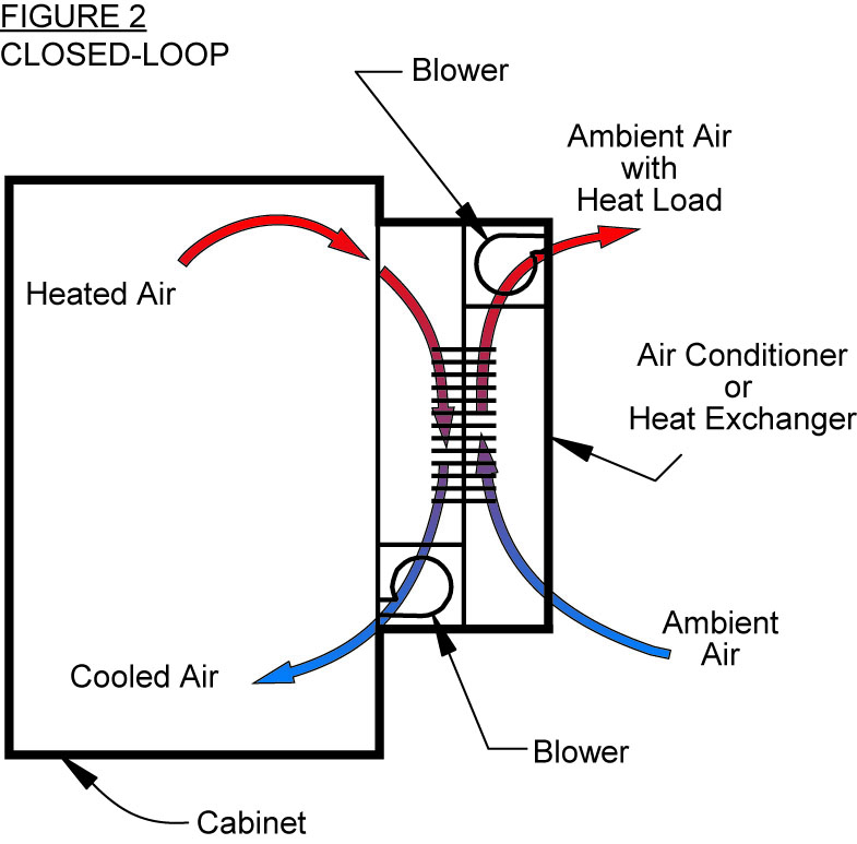 CLOSED-LOOP cooling describes a process that reconditions (reuses) the air inside an enclosure. Air conditioners and heat exchangers are examples of cooling products that use a closed loop. The purpose of this system is to prevent contaminated air from entering and causing damage to critical components, and when maximum internal cabinet temperatures cannot be maintained using open-loop ambient air cooling, closed-loop systems are used to satisfy this requirement. If the ambient air is hostile, containing dirt, oil, humidity or corrosives, this will adversely affect the performance or ultimate longevity of the components. Many applications using intricate electronic/electrical components require a closed-loop cooling system to dissipate heat buildup without introducing outside contaminated air. Air-to-air heat exchangers, water-to-air