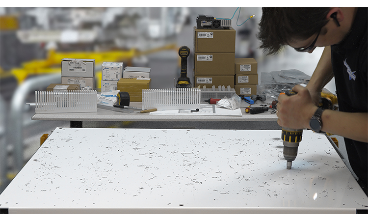 The first step is marking the interior panel—sometimes called a backplane or subpanel—and exterior layouts to match the drawings using a T-square and a mechanical pencil and blue tape. Pencil marks and blue tape are easily removed later in the process. Before drilling any holes, workers will usually mock the parts into place to ensure clearances look proper. This also gives them the chance to mark where mounting holes for components and wired ducts should be drilled.
