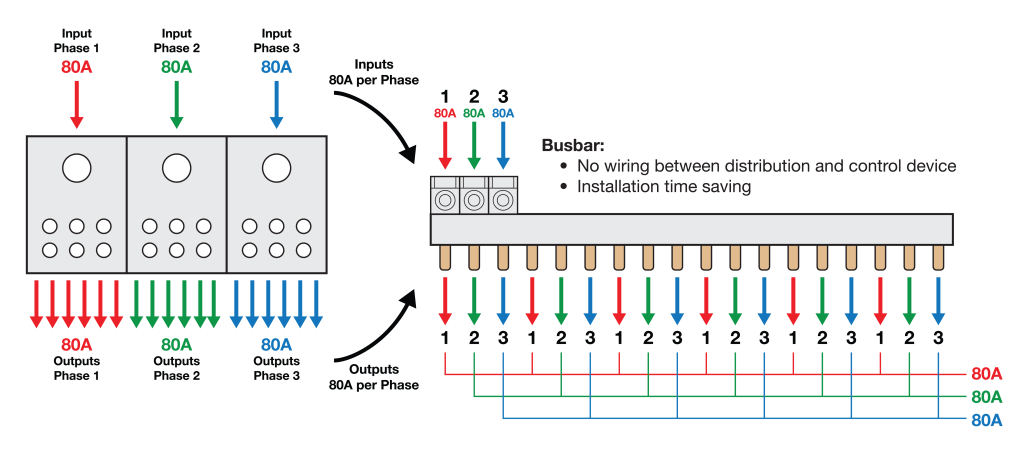 One popular distribution block is rated for 80A with one input and six outputs. To support the 80A inputs across three phases, a designer would need to add three units, each with its six 80-A outputs, side-by-side. However, a space-saving 3-phase 80A/480VAC 3P18U3/18 busbar for circuit breaker applications — part of the Altech 1077/508 Series — has an 18-pin, 6 x 3-pole configuration with mere 18 mm2 cross sections and a length of 315 millimeters (12.4 inches).