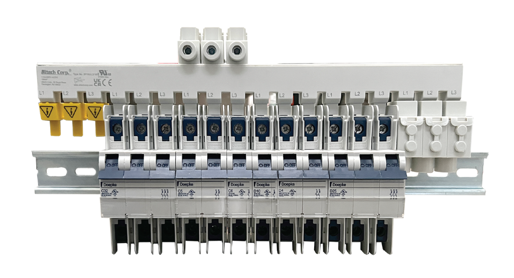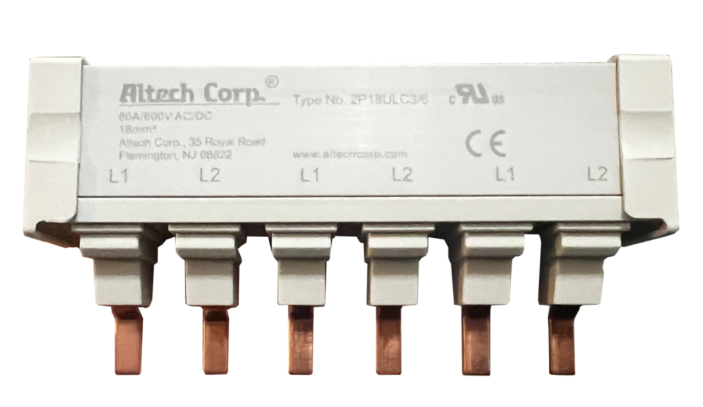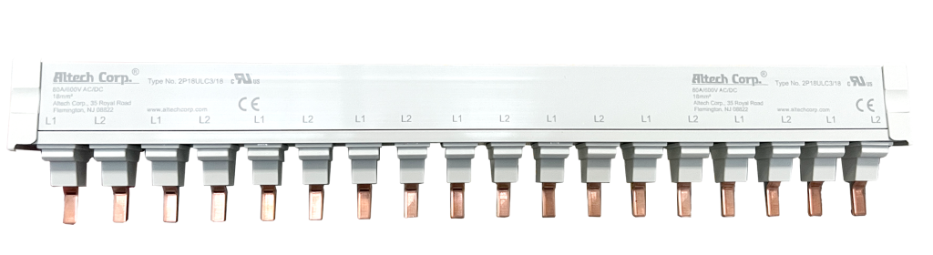 UL 489-compliant MCBs typically have a maximum line-rated current of 63A, although some MCBs are rated up to 115A for specific applications. Similarly, many MCBs are rated for 60 or 125V, but UL 489 covers higher voltages. Busbars come in single, double, and triple pole, with 6, 12, and 18 pins. Many UL 489 MCBs and busbars have separate accessories to make finger-safe terminals and end caps that keep installation and maintenance safe when working near energized components. Altech 489-listed busbars are rated to 115A/600V AC/DC.