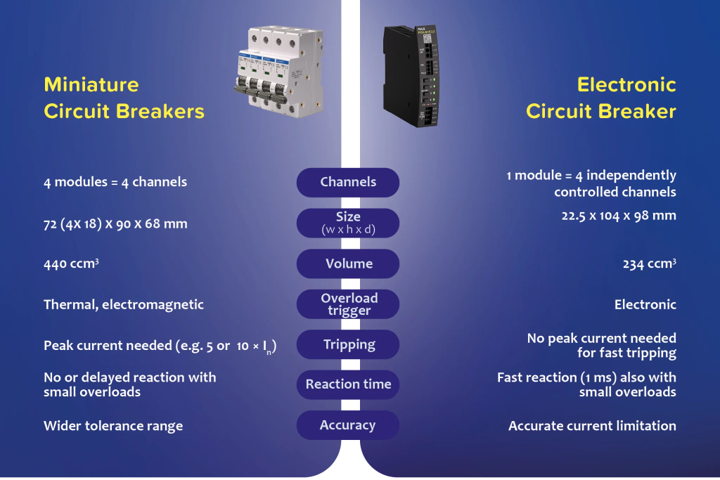 This blog article compares a traditional miniature circuit breaker (MCB) and an electronic circuit breaker (ECB) with integrated eFuses, highlighting the advantages of an ECB in terms of faster and more reliable tripping without the need for peak current.