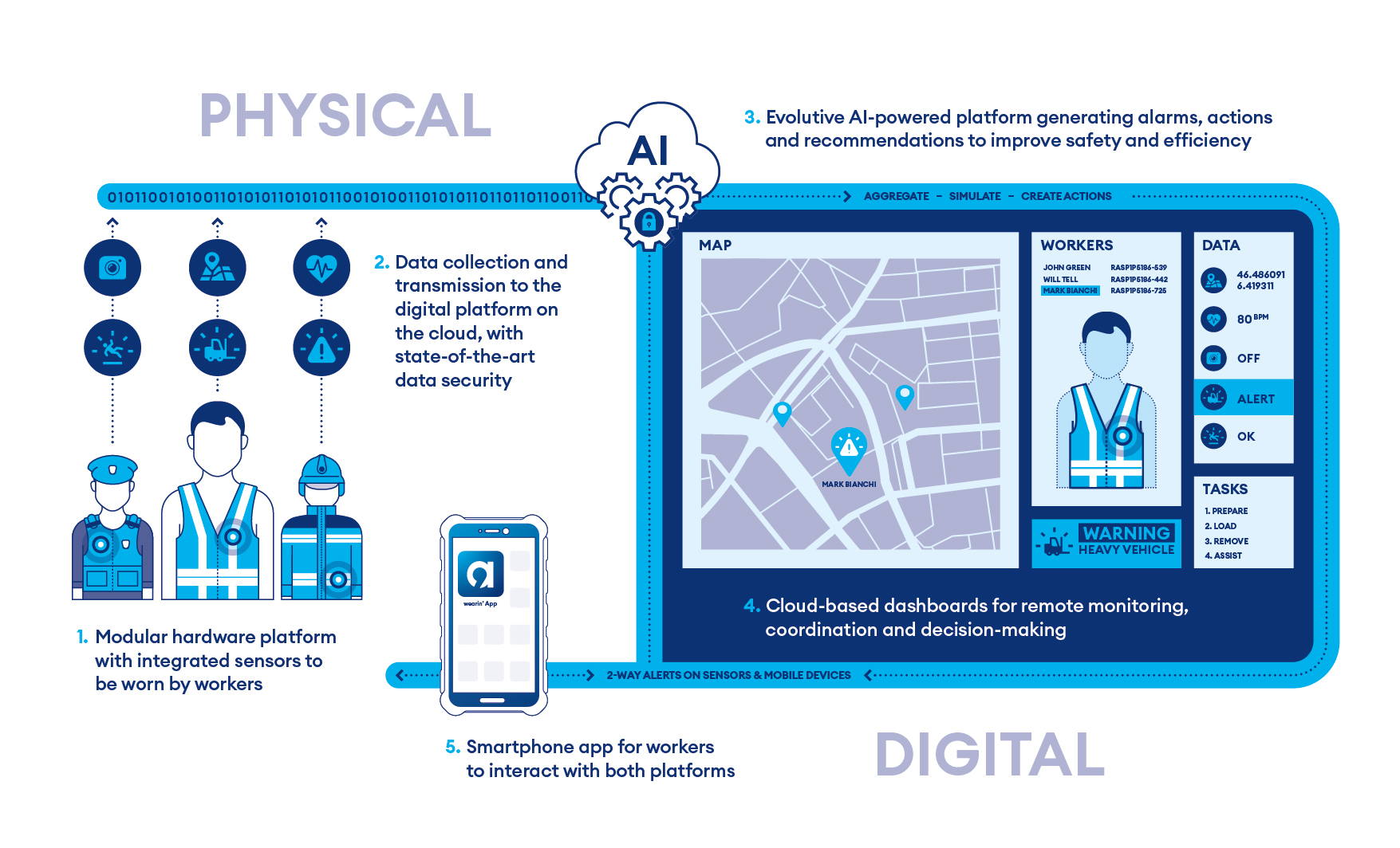 Unique in both its technological ingenuity and modularity, its solution makes high-risk work environments safer and smarter. Data from biometric sensors and environmental detection alarm systems worn by users in the field provide comprehensive real-time situational awareness to a central monitoring station. Via a cloudbased dashboard platform powered by artificial intelligence, the central station can communicate real-time information and recommendations that improve safety, efficiency and the collective coordination of ongoing operations and responses.