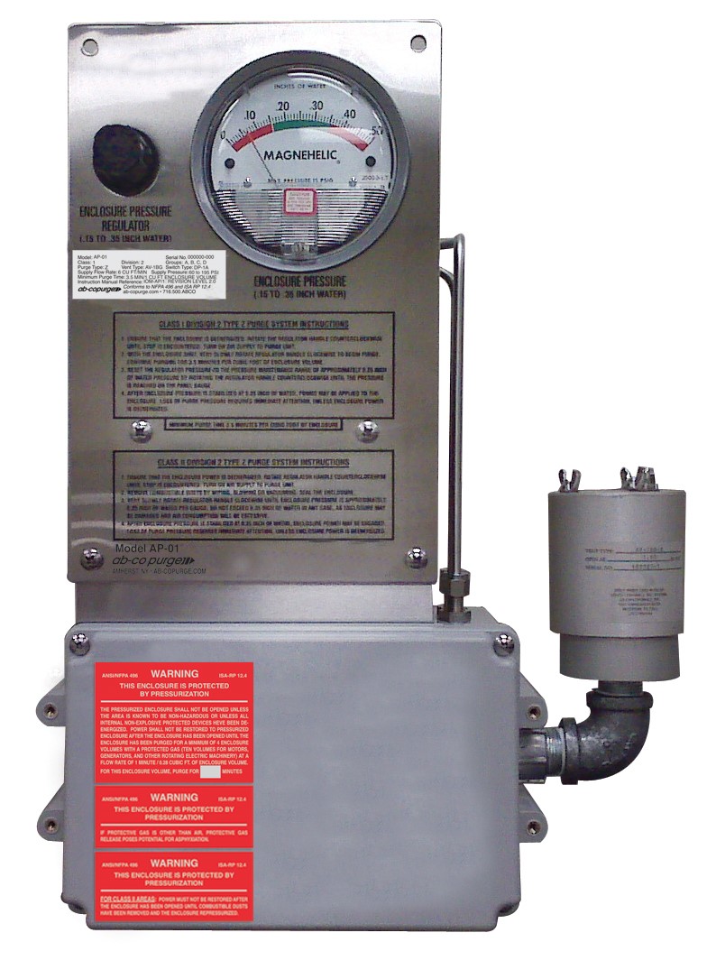 The AB-CO PURGE Model AP-01Z-02 Purge and Pressurization System is a Z-Type system designed specifically for small electrical enclosures with volumes up to 2 cubic feet (0.056 cubic meters).