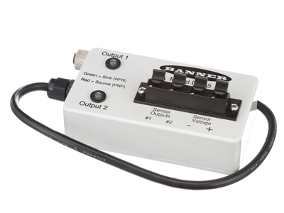 This test box works with any brand DC-powered sensor and is great for experimenting and testing photoelectric, proximity, and ultrasonic sensors. Clearly visible, illuminated LEDs indicate the switching status of the test box and an acoustic signal. Don’t forget batteries for the Banner DBQ5 to provide hours of power!