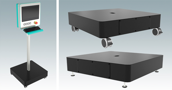 With a maximum static load capacity of 110 lbs (50 kg), this GOST-certified base is extremely robust. The feet are adjustable and the castors have footswitches that lock the wheels for safety. Simply add an upright and bolt your screen in position. The 1.00″ x 1.57″ central aperture for the upright allows plenty of space for HDMI, DVI and network cables. There is also a removable cable gland plate on one side for cable entry. Specify the new base in black (RAL 9005) as standard or in custom colors.