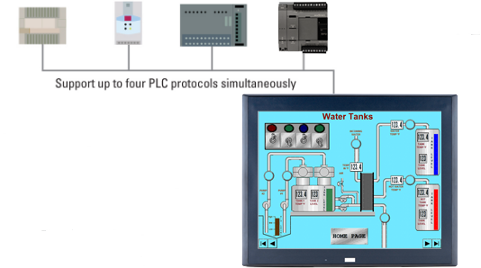 - Support multiple protocols—connects up to four PLC protocols simultaneously. Using one HMI to communicate with different brands (or manufacturers) of PLCs in a system saves time and money. The touchscreen acts as a communication gateway between multiple devices allowing data to easily pass between devices.