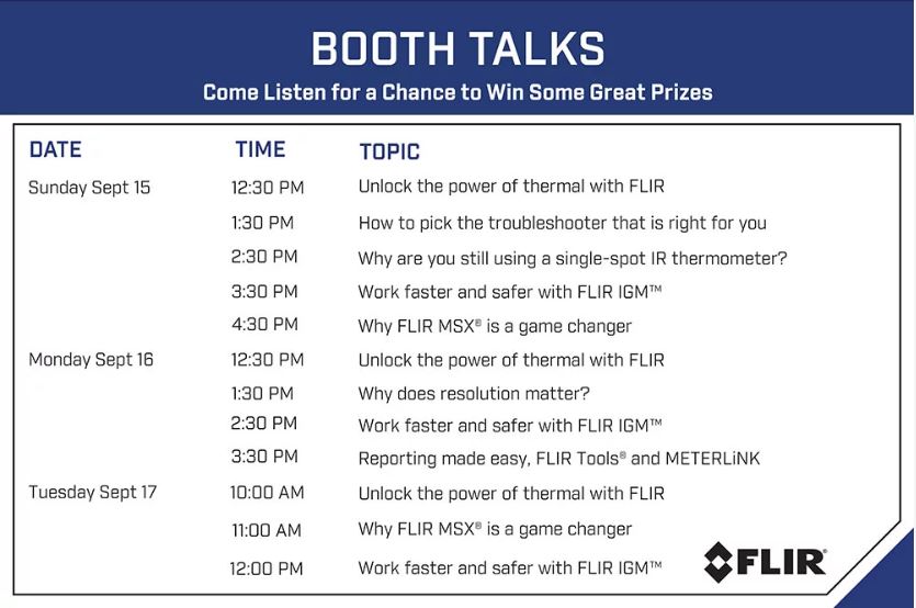Technical workshop. Join FLIR’s Pietrina Mannino for a deep dive into how thermography can significantly improve safety and efficiency while performing inspections on energized equipment. The workshop is scheduled for Sunday, September 15, 2019 from 12:00-12:50 PM.
